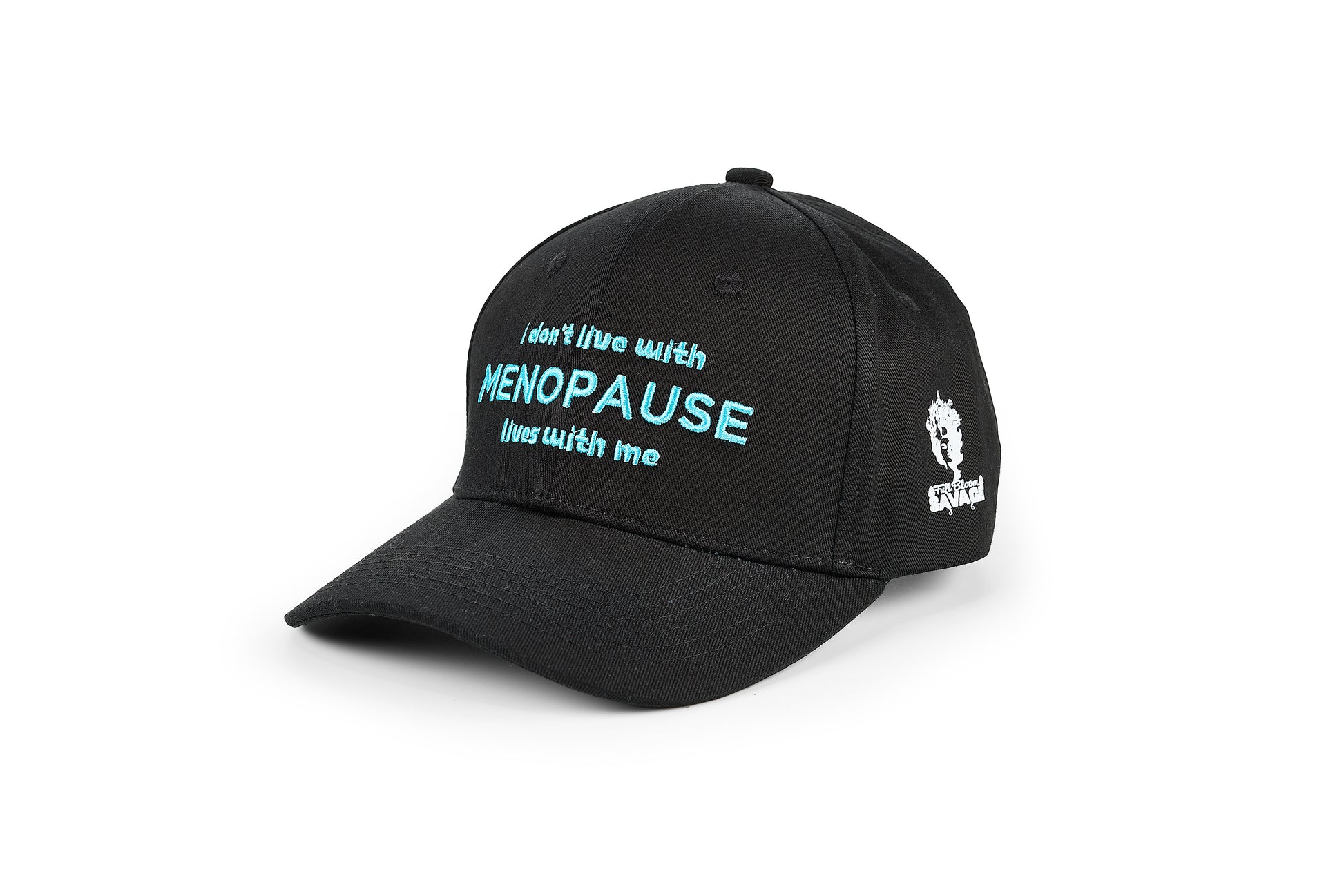 The I Don’t Live With Menopause cap comes in black or dark grey with bold blue stitching and a silky satin lining to protect your hair while you conquer your day. It’s built for women who refuse to shrink, apologize, or let menopause take the wheel.