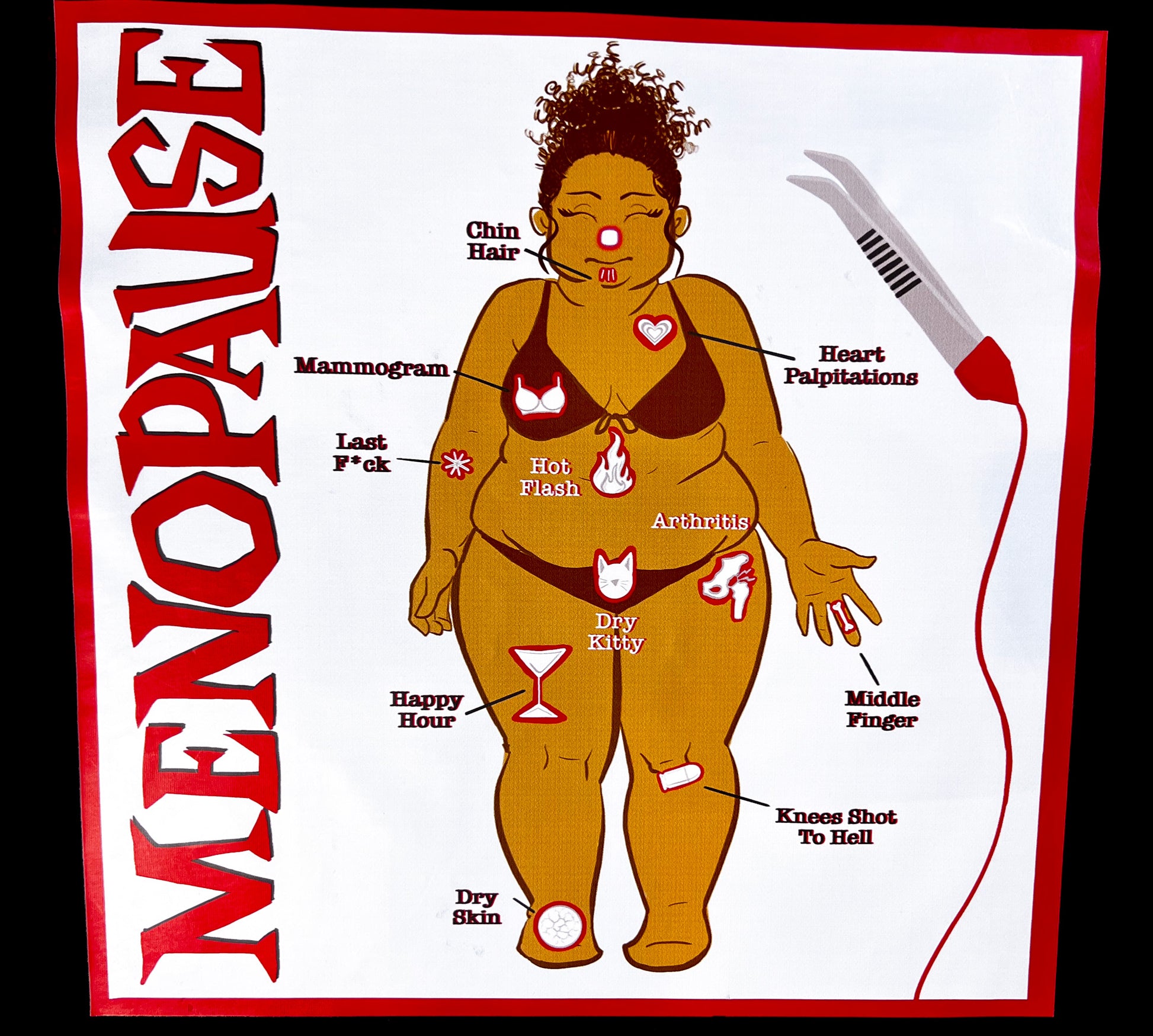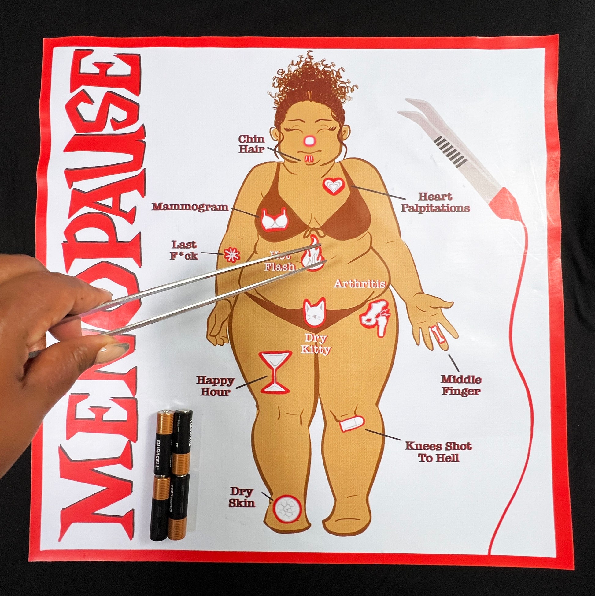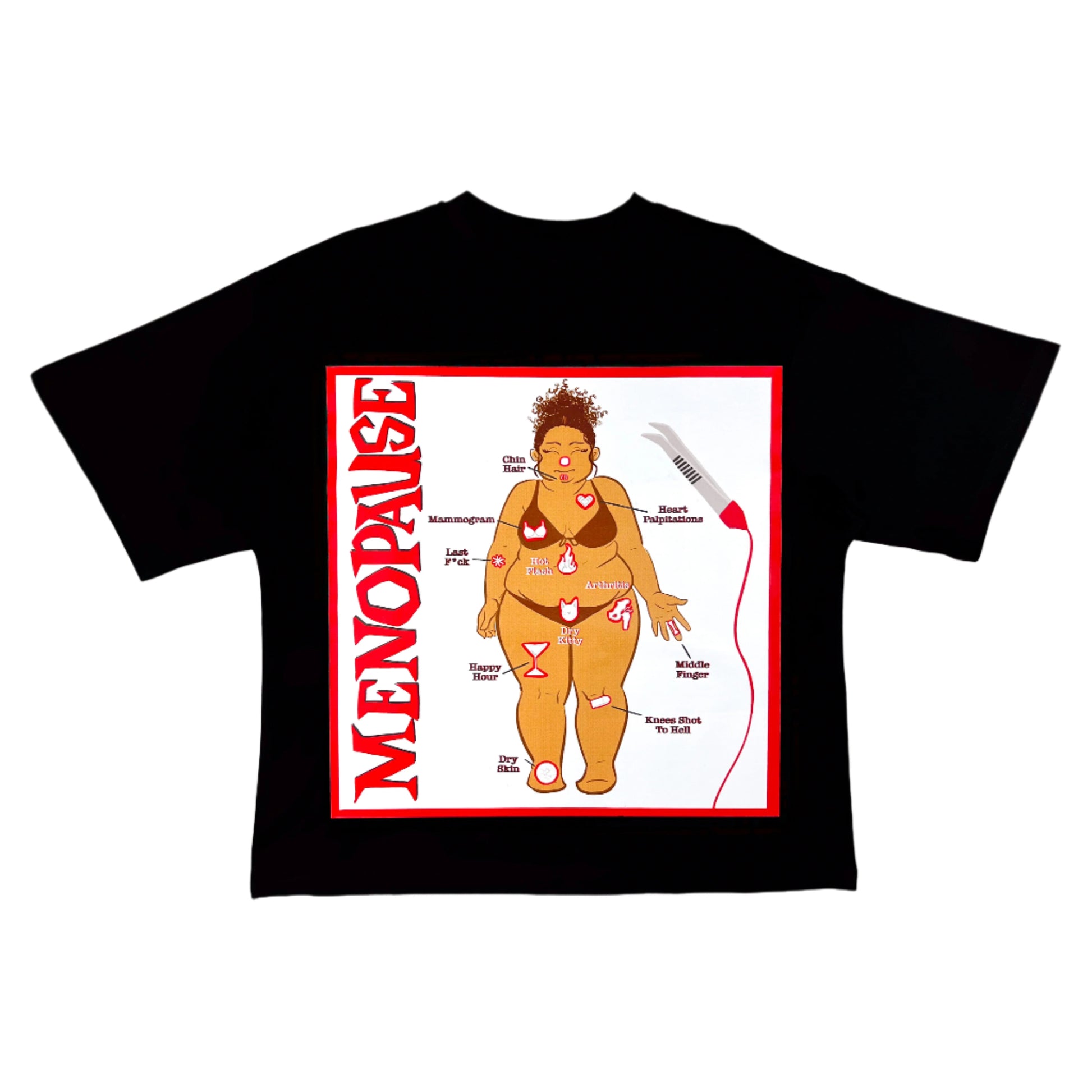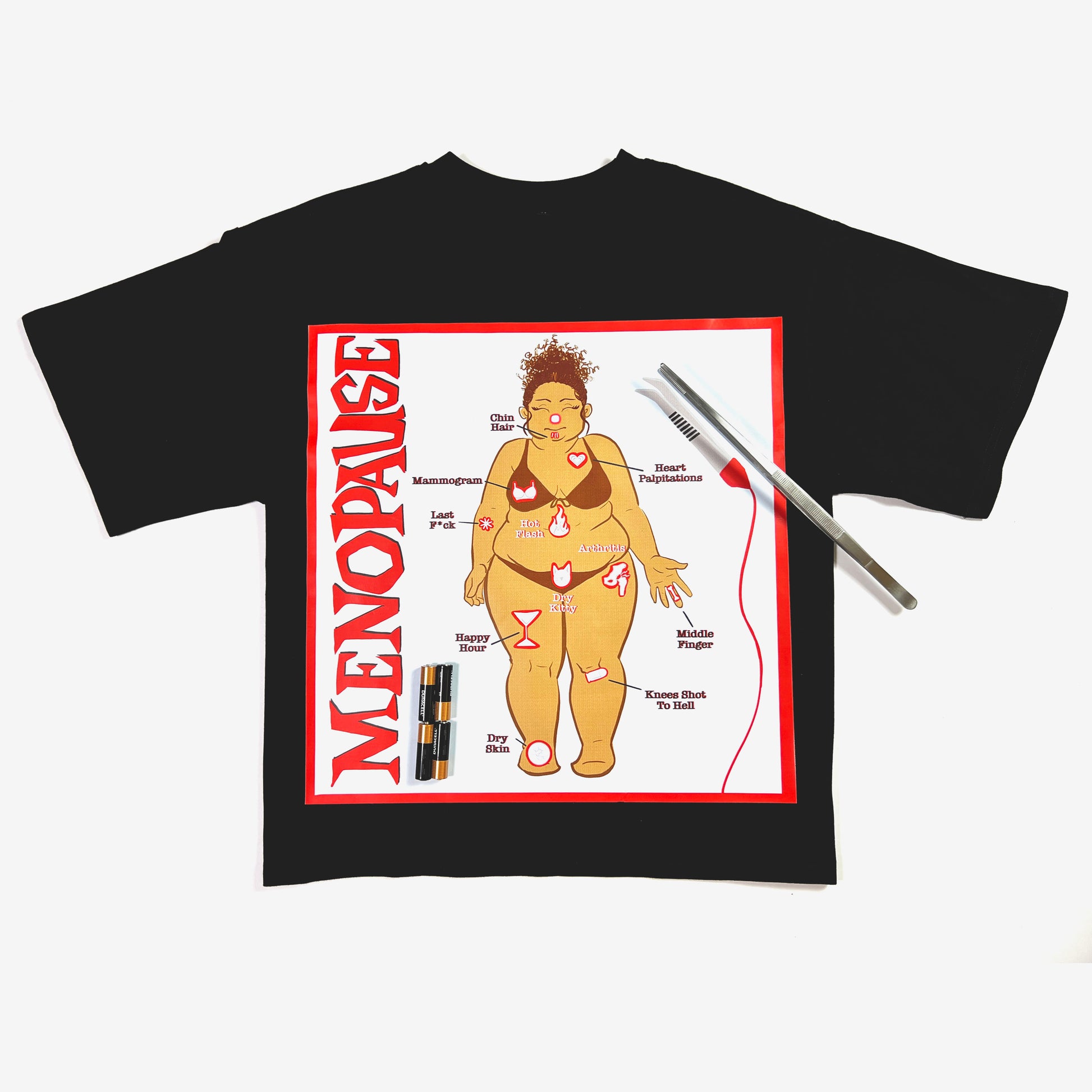 Step into the game of Operation—menopause edition! This black 100% cotton oversized mock crop tee reimagines the classic '80s game *Operation* with a cheeky twist: a woman navigating the hilariously relatable symptoms of menopause. Whether it’s plucking out a "Hot Flash" or steadying your hand near the "Middle Finger," this bold graphic celebrates the humor and resilience of this life stage.